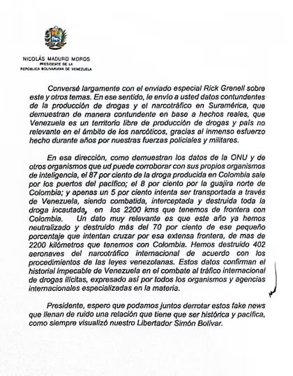 “Es el peor de los fake news que se ha lanzado contra nuestro país para justificar una escalada a un conflicto armado que le haría un daño catastrófico a todo el continente”, escribió Maduro, negando cualquier relación con mafias o bandas narcotraficantes. El líder chavista insistió en que Venezuela es un territorio “libre de producción de drogas”, y que solo un 5% de la droga producida en Colombia intenta cruzar su frontera de más de 2.200 kilómetros. Añadió que, en lo que va del año, las fuerzas venezolanas han neutralizado y destruido más del 70% de ese porcentaje, incluyendo 402 aeronaves ligadas al narcotráfico.
