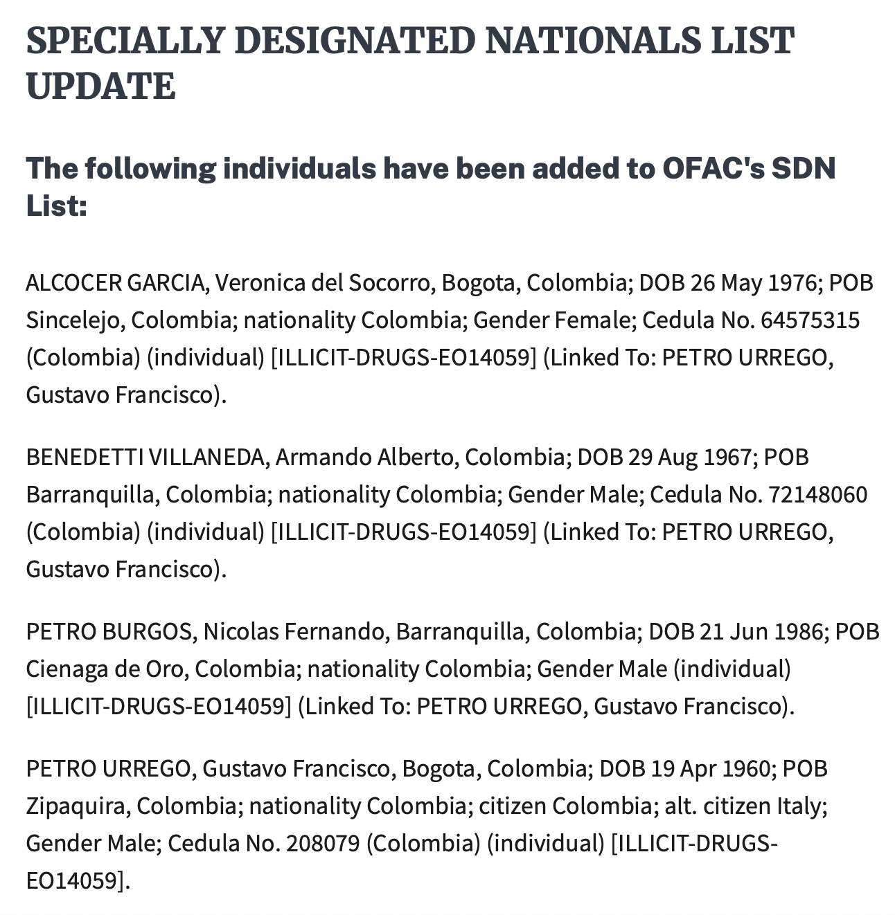 🇺🇸🇨🇴‼️ | ÚLTIMA HORA — El presidente Donald Trump incluyó a Gustavo Petro, su esposa Verónica Alcocer, su hijo Nicolás Petro y al ministro Armando Benedetti en la lista OFAC, también conocida como la lista Clinton.