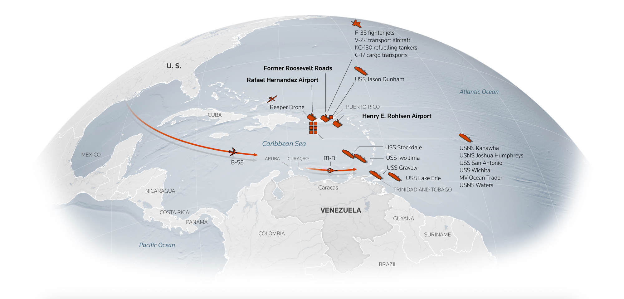 Roosevelt Roads, una de las mayores estaciones navales de EE.UU. durante la Guerra Fría, ofrece una ubicación estratégica y amplio espacio para concentrar equipo, según un oficial estadounidense. Además, EE.UU. está ampliando instalaciones en aeropuertos civiles de Puerto Rico y St. Croix (Islas Vírgenes), a unos 800 kilómetros de Venezuela.