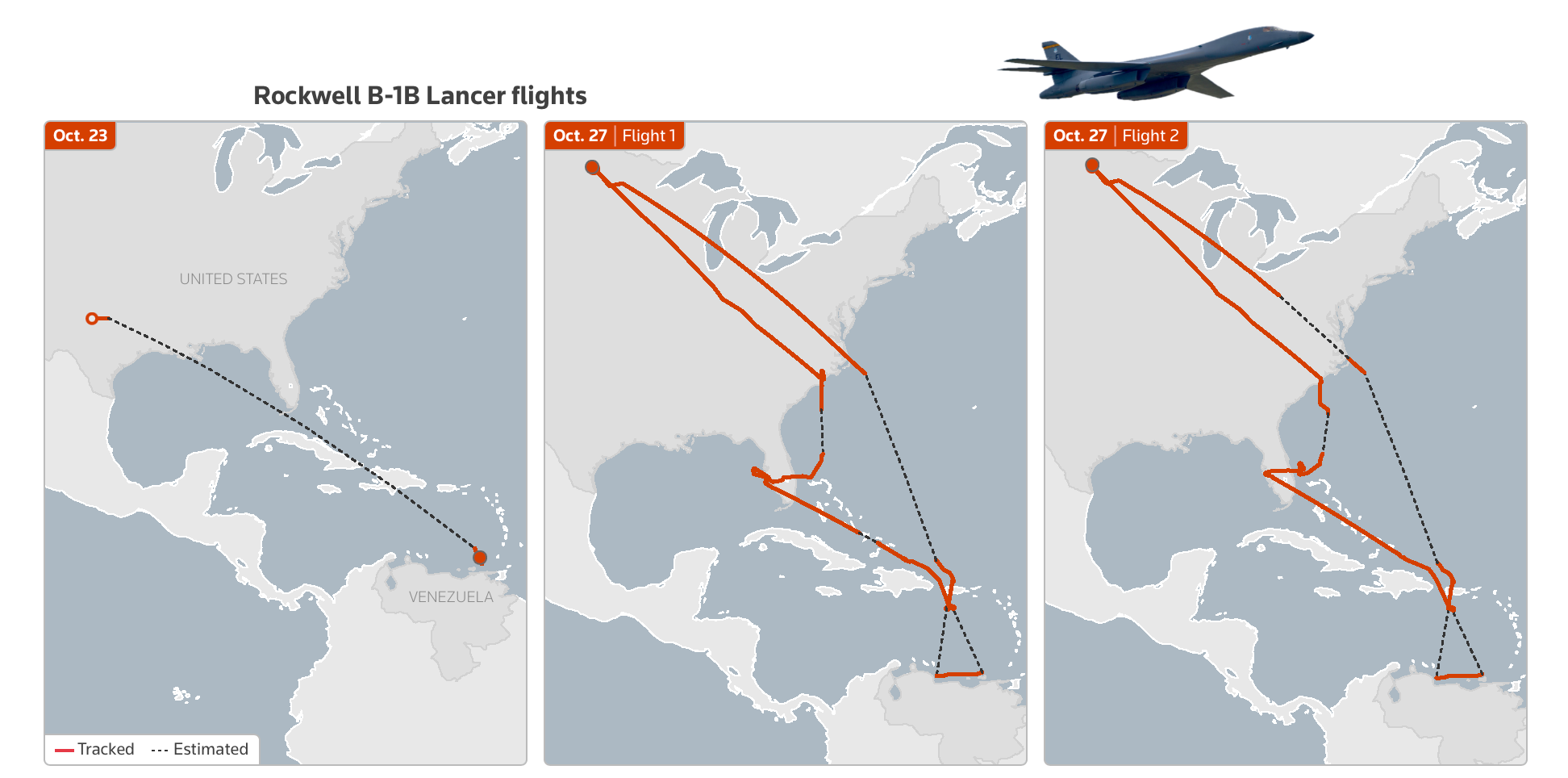 - Bombarderos estratégicos: Tres B-1B Lancer volaron cerca de la costa venezolana el 23 y 27 de octubre. Tres B-52 Stratofortress lo hicieron el 15 de octubre.