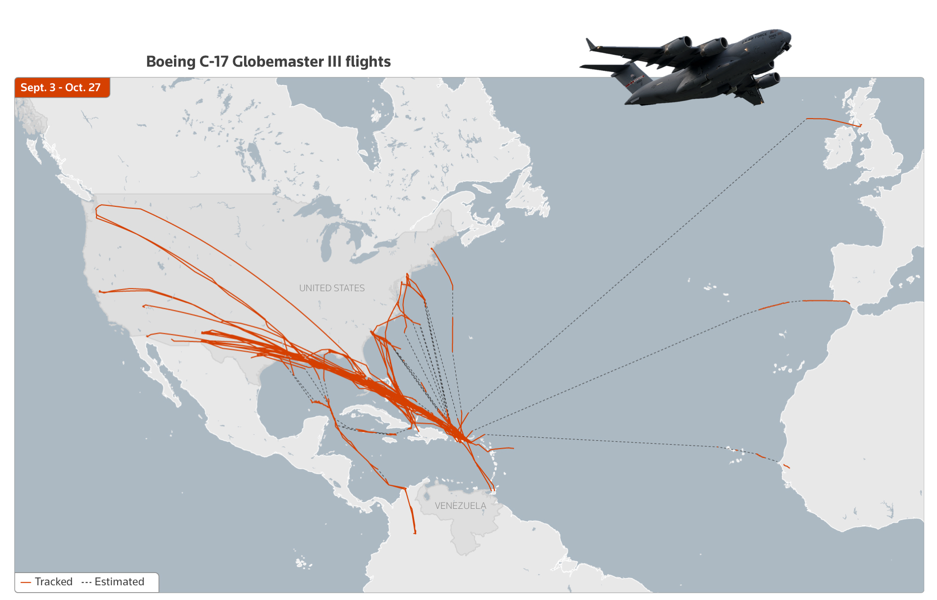 - Aviones de carga: Decenas de C-17 Globemaster III aterrizaron en Puerto Rico entre septiembre y octubre, posiblemente transportando armas, drones o suministros.