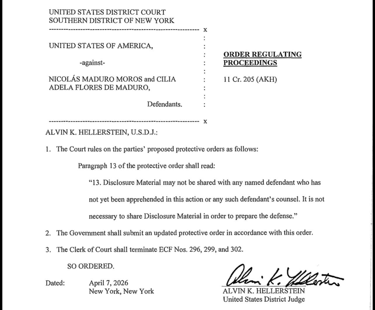 El juez federal, Alvin Hellerstein, denegó la solicitud de la defensa de los criminales Nicolás Maduro Moros y Cilia Flores para compartir información probatoria con otros coacusados en la causa. La resolución confirma la postura de la fiscalía, que busca… pic.twitter.com/HD3RTz4WrN