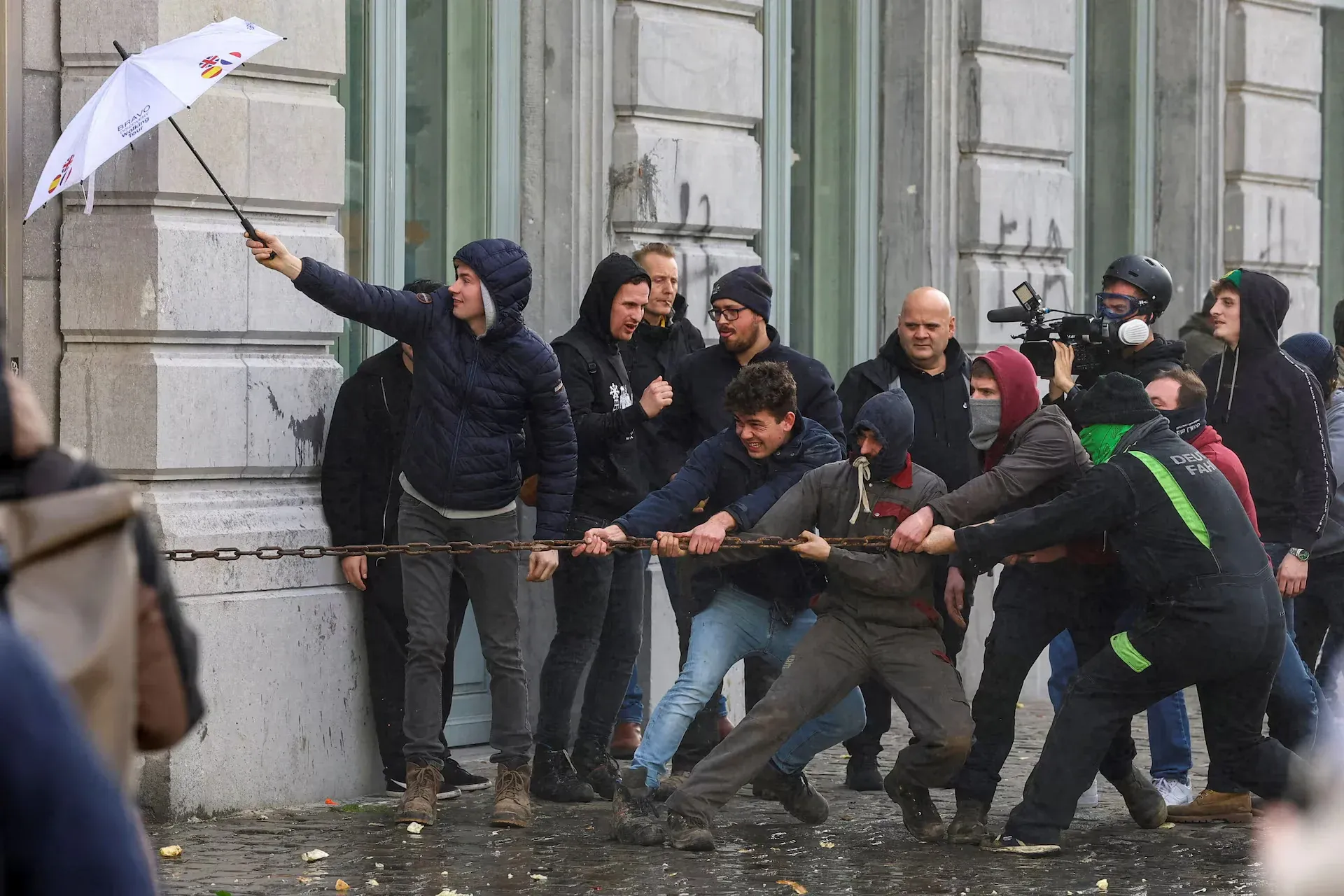 Las acciones incluyeron bocinas constantes, lanzamiento de bombas de humo y papas contra la policía, lo que provocó enfrentamientos con uso de cañones de agua y gas lacrimógeno por parte de las fuerzas de seguridad. Objetos ardientes aparecieron cerca del Parlamento Europeo, aunque no se reportaron detenciones masivas.