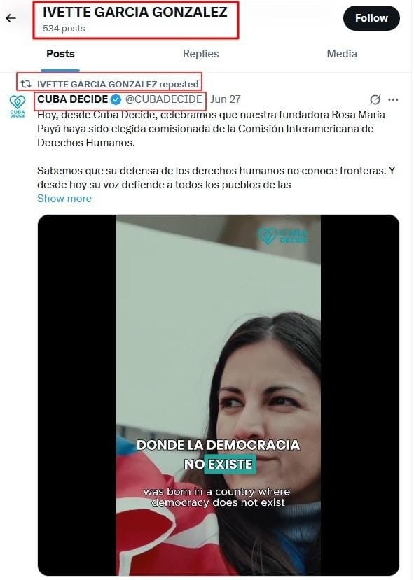 Stone revela que García González llegó a Estados Unidos en julio de 2025 solicitando asilo político, presentándose como disidente del régimen. Sin embargo, el autor la acusa de ser una "agente doble" enviada para infiltrar comunidades exiliadas y académicas, posiblemente bajo órdenes del régimen de Maduro y Castro. Stone critica a congresistas como Carlos Giménez y Mario Díaz-Balart por supuestamente ignorar su presencia, alegando que protegen intereses comerciales vinculados a Cuba, como contratos de defensa con empresas que operan bajo supervisión cubana.