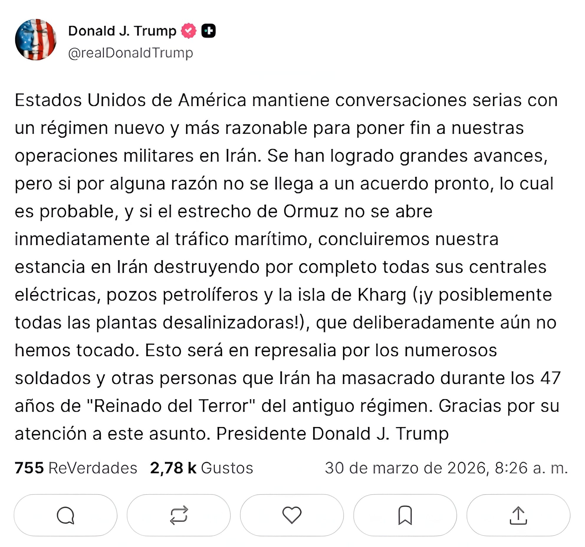 Este lunes el presidente Donald Trump, a través de su plataforma Truth Social, ha lanzado un ultimátum definitivo al régimen de Teherán: o se alcanza un acuerdo de paz "en breve" y se desbloquea el Estrecho de Ormuz, o Estados Unidos procederá a la destrucción total de la infraestructura energética e hídrica de Irán. La amenaza incluye objetivos específicos como la isla de Kharg (el pulmón de las exportaciones petroleras iraníes), pozos de crudo, plantas generadoras de electricidad y desalinizadoras. Según Trump, estas instalaciones han sido "deliberadamente preservadas" hasta ahora, pero la paciencia de Washington ya se ha agotado.