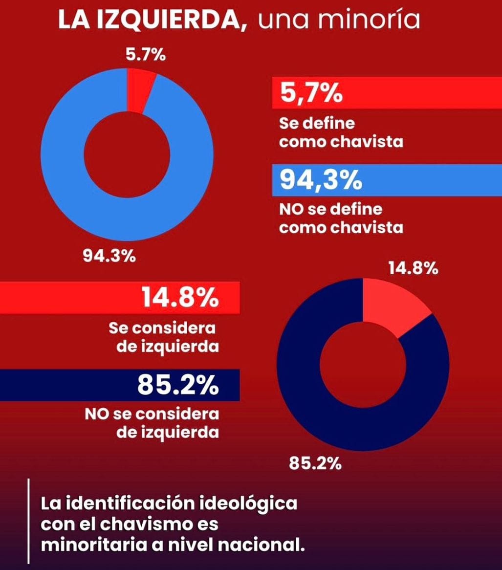 El desplome de la base social del chavismo ha llegado a niveles de marginalidad estadística. En la actualidad, solo el 5,7% de los venezolanos se identifica como chavista, dejando a todo el espectro de la izquierda en un raquítico 14,8%. Esta evaporación del apoyo popular confirma que el movimiento fundado por Hugo Chávez ha pasado de ser una fuerza política a una sombra despreciada por la inmensa mayoría de la sociedad.